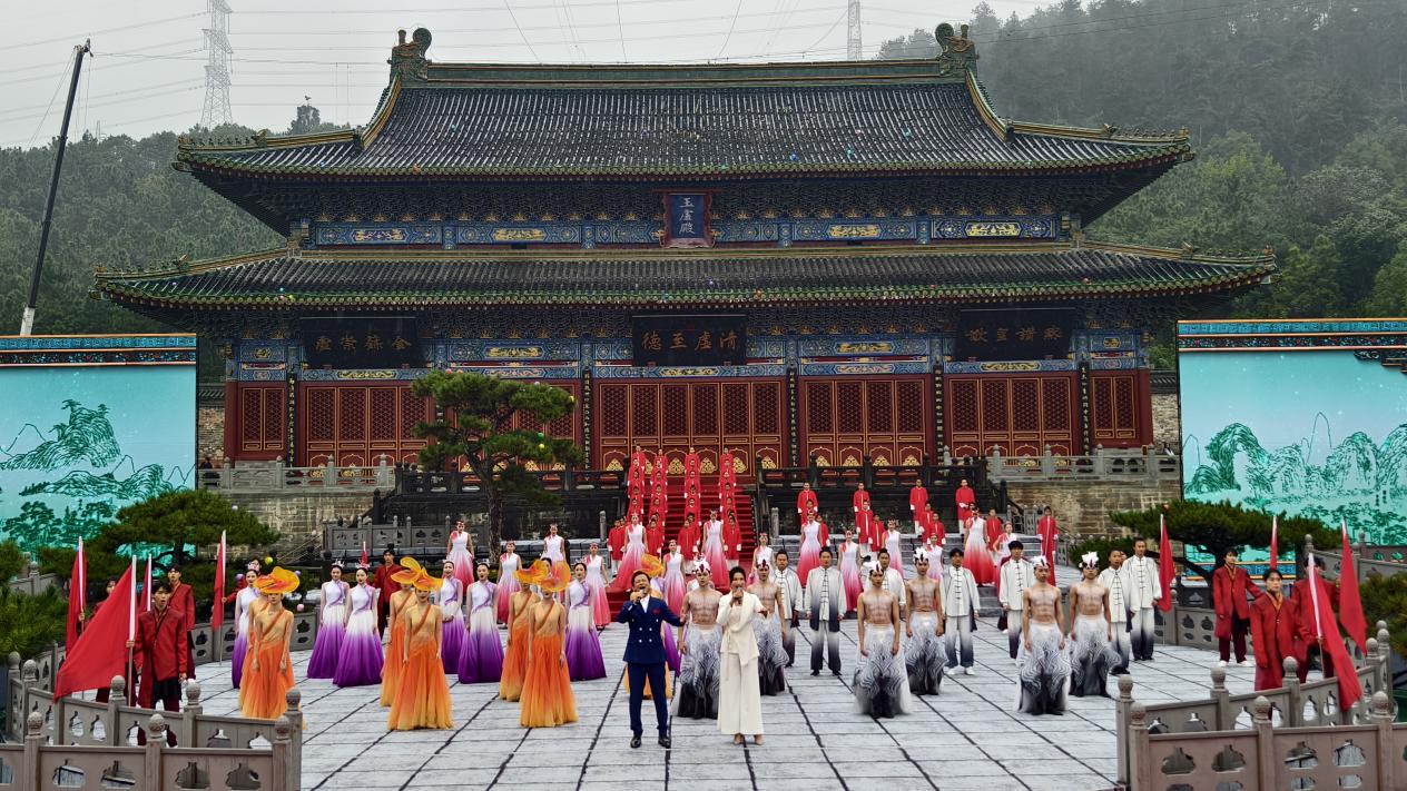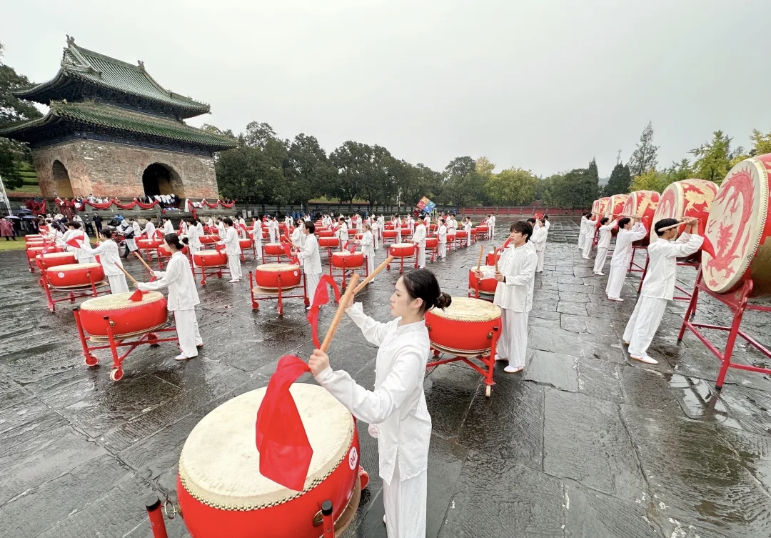 开幕式在一场循古礼、承太极的迎宾盛典中拉开帷幕。在玉虚宫宫门前的广场上,鼓乐表演《武当启泰曲》开始,随着雄劲的鼓声响起,旗阵演员随鼓点变换队形,生动诠释“易有太极,是生两仪”的古老智慧。笙乐融入武当道乐清虚之韵,重现“我有嘉宾,鼓瑟吹笙” 的迎宾雅礼。大道两侧,60名身着明代服饰的演员以艺术化的肢体语言,生动再现了明成祖朱棣当年敕建武当的恢弘图景。来自武当山各大武校的 “太极娃”、千名身着太极服的表演者与武当、少林、峨眉、崆峒、昆仑、华山六大武术门派上演 “千人太极”“演武和合”,展现了中华武术的传承活力。